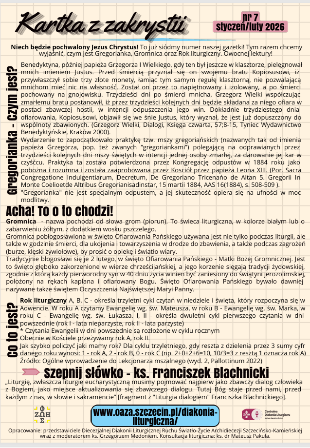 Zapraszamy do zapoznania się z kolejnym, już siódmym numerem „Kartki z zakrystii” – biuletynu przygotowanego przez Diakonię Liturgiczną.